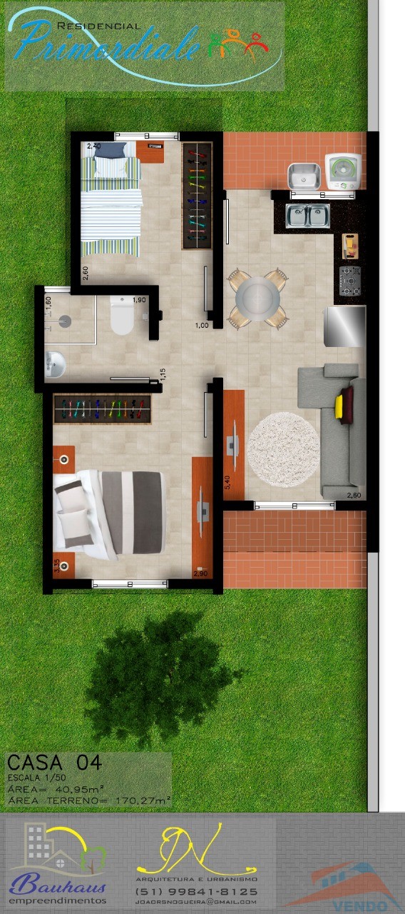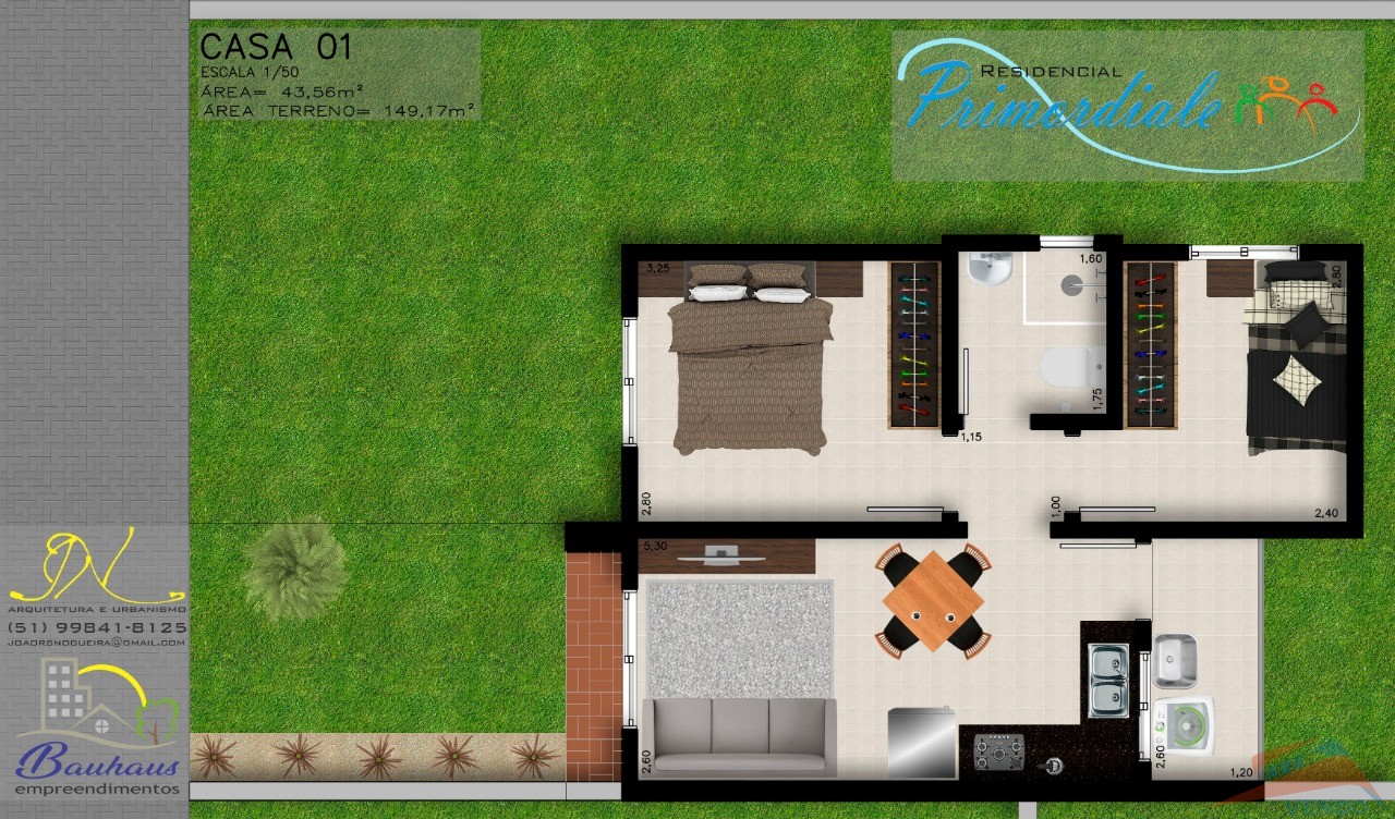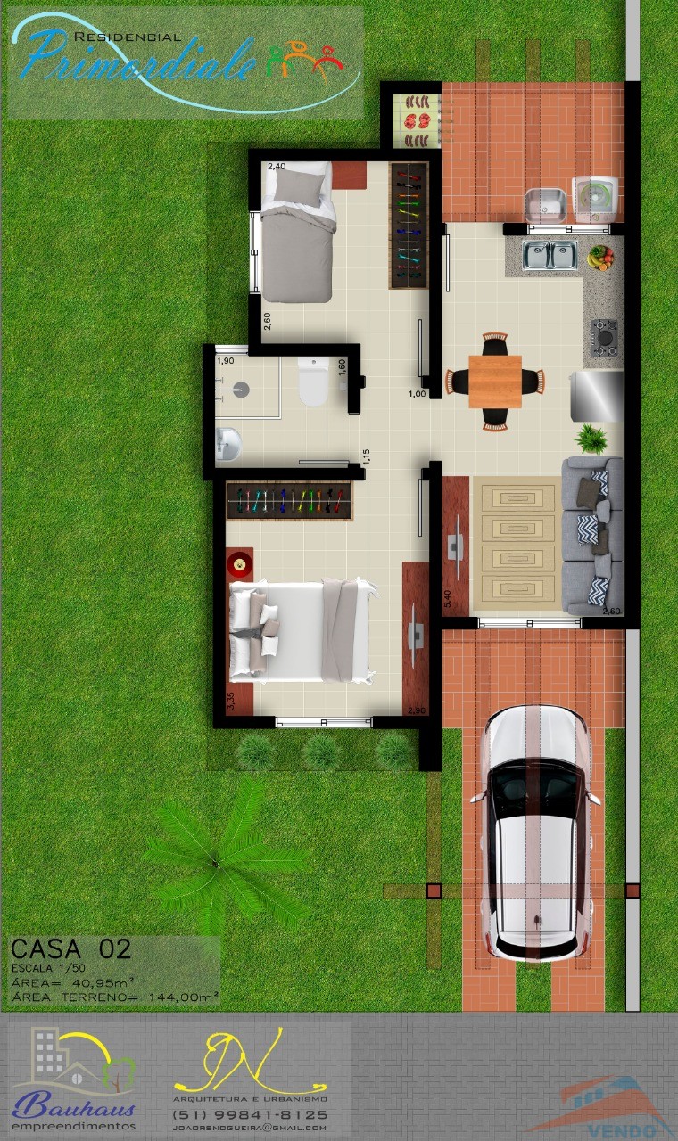 Casas com opção de dois ou três dormitórios, salas de estar/jantar e cozinha em ambiante integrado, lavanderia, banheiro social, pátio fechado.