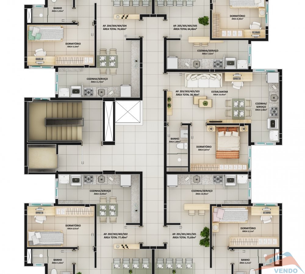 - Revestimento cerâmico em Porcelanato;